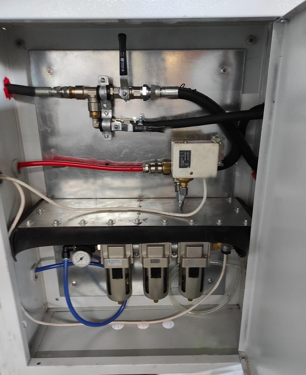 В стандартной комплектации мы поставляем с оборудованием шкаф коммутации и подготовки газа с возможностью подключения балонного кислорода и воздуха для обдува линзы от цеховой пневмо-системы. По желанию заказчика мы можем поставить комплект оборудования подготовки воздуха высокого давления: поршневой компрессор (до 25бар, 900л/мин, 68дБ), ресивер (до 25бар, 270л), каскад фильтров (20мкм, 5мкм, 0.01мкм), редуктор с манометром, автоматику безопасности, автоматику слива конденсата с ресивера, осушитель воздуха. Также по желанию заказчика, воздух для обдува линзы может быть подключен к линии высокого давления через понижающий редуктор.